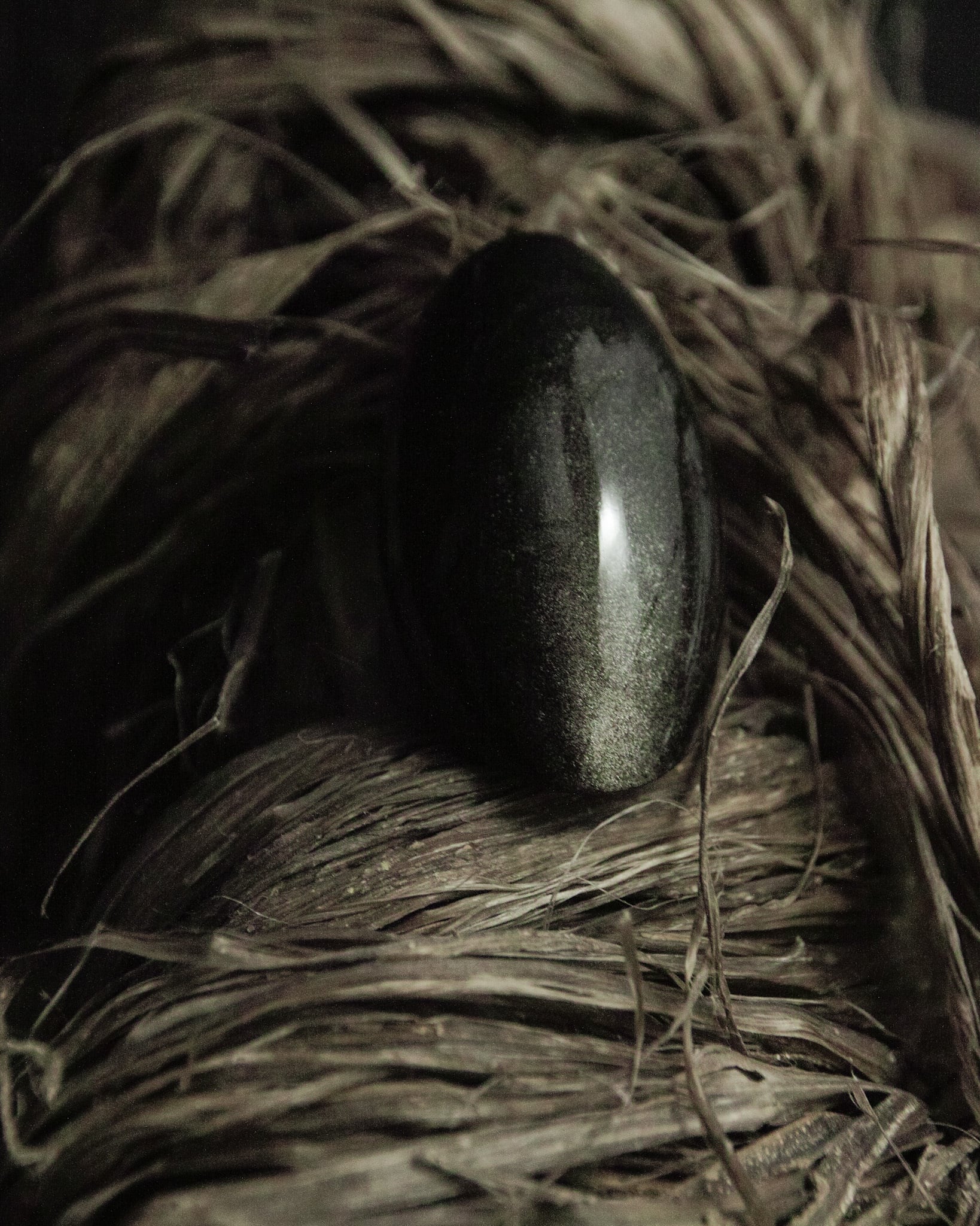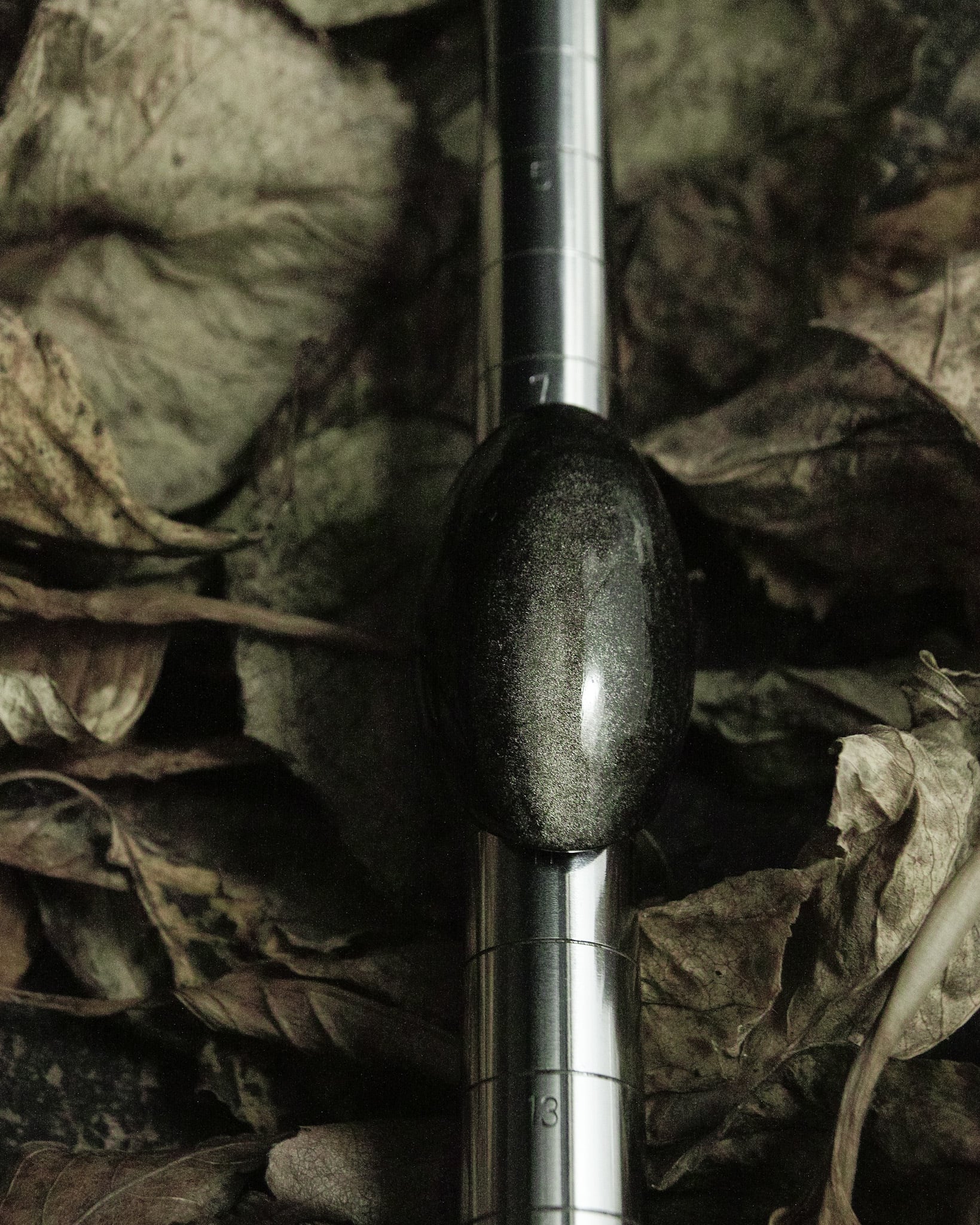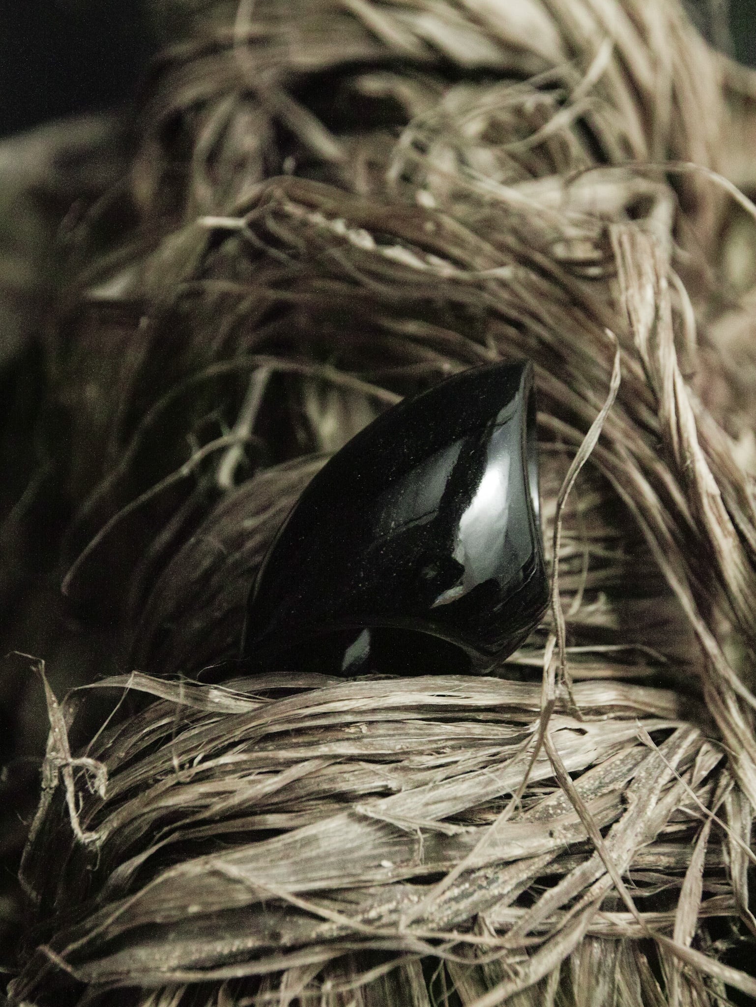 深い黒の中に、角度によって現れるシルバーやグリーンを思わせる虹色の光。